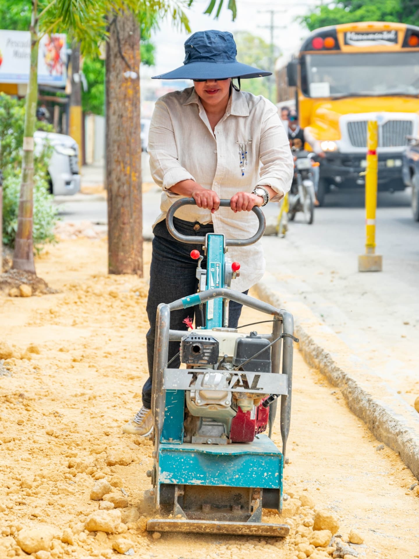 Durante la visita, la alcaldesa inspeccionó los trabajos de construcción de aceras y contenes en la salida hacia El Seibo, una obra que busca facilitar el tránsito peatonal y contribuir al embellecimiento de la ciudad.